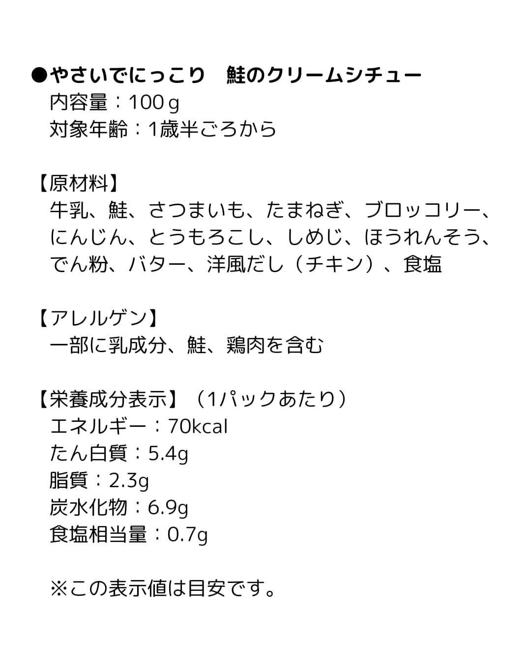鮭とごろごろ国産野菜の彩りもきれいなクリームシチューです。それぞれの素材本来の味を楽しめるよう具材のサイズにもこだわりました。ごはんやパンと一緒に、またはクリームパスタとしてもおいしく食べていただけます。